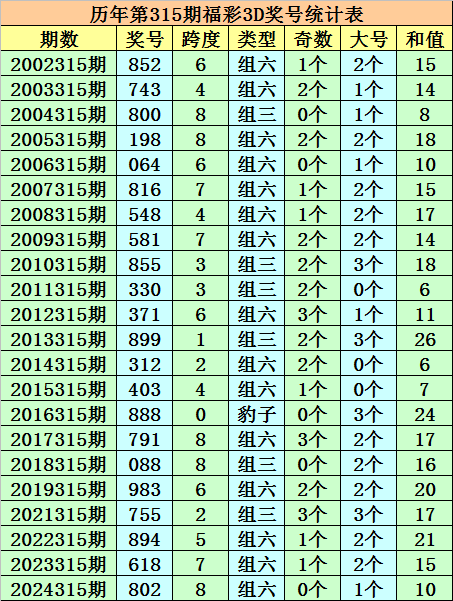 历年第315期福彩3D同期奖号为:852 - 743 - 800 - 198 - 064 - 816 - 548 - 581 - 855 - 330 - 371 - 899 - 312 - 403 - 888 - 791 - 088 - 983 - 755 - 894 - 618 - 802。