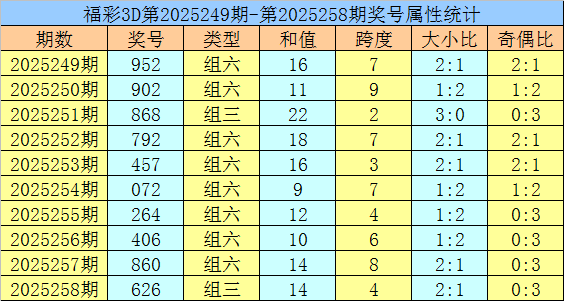 开奖回顾:福彩3D第2025258期开出奖号626。奖号形态为组三,奇偶比为0:3,012路比为2:0:1,大小比为2:1,和值为14,跨度为4。
