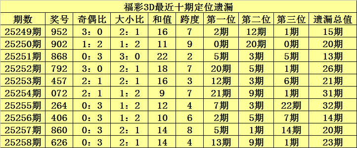 开奖回顾:福彩3D第2025258期奖号:626,百位号码遗漏13期、十位号码遗漏9期、个位号码遗漏1期,遗漏总值为23期。
