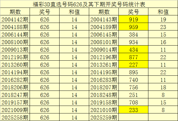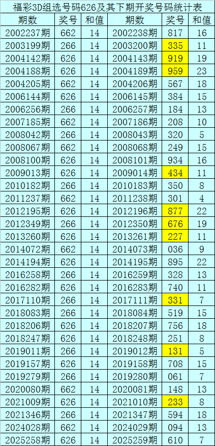 一、开奖回顾:第2025258期福彩3D奖号为626。奖号奇偶比为0:3,和值为:14,跨度为:4。