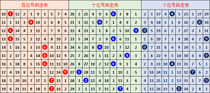 百位号码:近10期奖号为:1,4,1,1,6,6,6,9,7,7,奖号大小比开出6:4,本期看好大码球热出,关注百位出号9。
