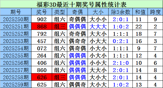 上期回顾:上期开奖奖号为625,类型:组六,偶偶奇,大小大,1:0:2,和值13,跨度4。