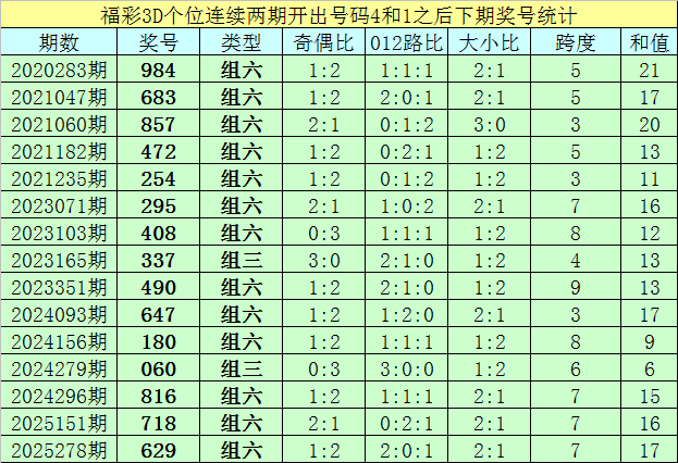 个位号码:最近两期个位开出号码为4-1,在福彩3D历史开奖中,前后两期个位分别开出号码4-1的奖号出现了81次。最近15期个位4-1组合出现之后,其下期奖号分别为:984-683-857-472-254-295-408-337-490-647-180-060-816-718-629;