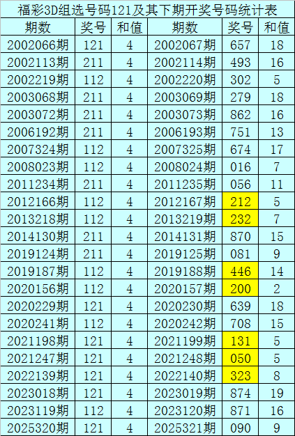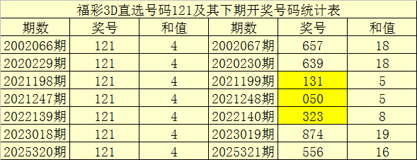 一、开奖回顾:第2025320期福彩3D奖号为121。奖号奇偶比为2:1,和值为:4,跨度为:1。
