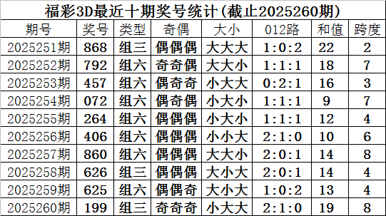 开奖回顾:福彩3D第2025260期奖号为199,奖号形态为:组三、小大大、2:1:0、奇奇奇。