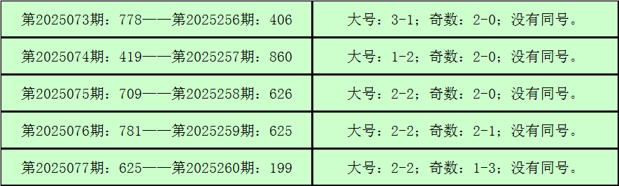 统计3D历史上已开出的奖号发现,在连续5期开奖号码中:3D在第2025073期-第2025077期分别开出奖号:778-419-709-781-625。