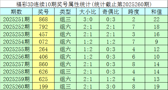 开奖回顾:福彩3D第2025260期奖号为199。奖号形态为组三,大小形态为小大大,奇偶形态为奇奇奇,和值为19,跨度为8。