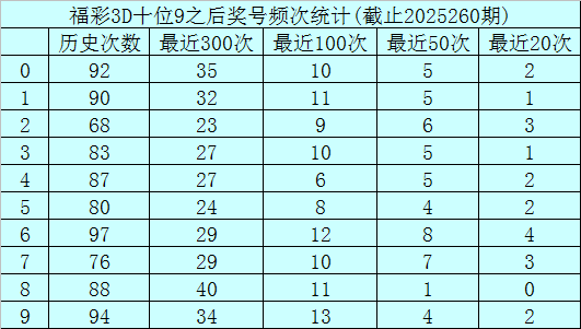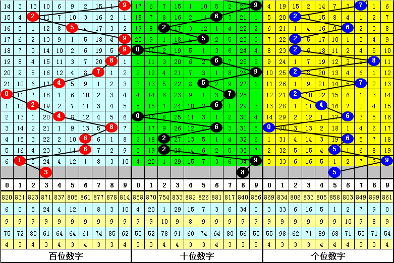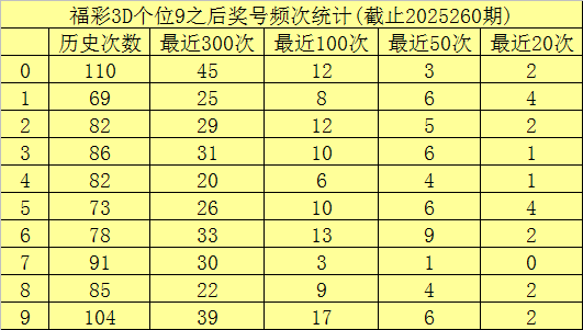 个位杀号:上期个位奖号为9,历史上个位奖号9共开出861次,最近100次个位奖号9出现时,其下期号码0-9开出次数分别为:奖号9开出17次,6开出13次,0、2开出12次,3、5开出10次,8开出9次,1开出8次,4开出6次,7开出3次。