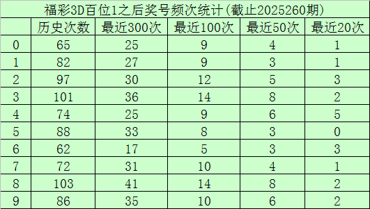 百位杀号:上期百位开出号码1,历史上百位号码1已开出831次了,最近100次百位号码1出现之后,其下期各号码频次分别为:号码8、3出现14次,2出现12次,7、9出现10次,0、1、4出现9次,5出现8次,6出现5次。