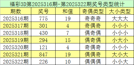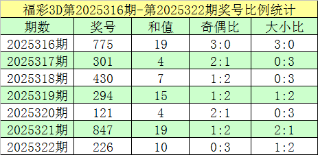 福彩3D第2025322期回顾:奖号为226,奖号奇偶比为0:3,大小比为1:2,和值为10,类型为组三。