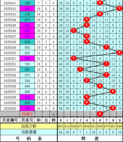 福彩3D第2025260期最大跨度开出8,跨度近期分布比较密集,主要分布在4-8区段,本期预计最大跨度在4-8区段出现,最大跨度关注45678,精选跨度6。