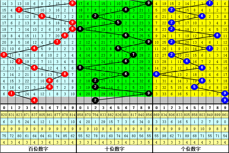 跨度分析:3D上期跨度为8,跨度近期波动较小,一般出现在4-8之间,本期看好跨度出现在5-9之间,最大跨度参考6789,参考跨度7。