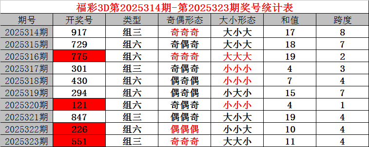 上期回顾:福利彩票3D第2025323期开奖结果551。奖号:奇奇奇、大大小,和值11,跨度4。