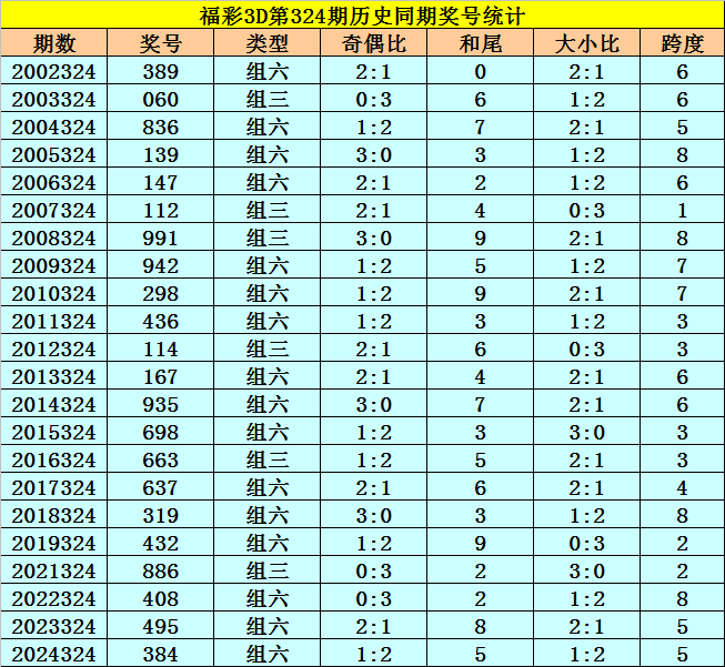福彩3D历年第324期同期奖号为:389 060 836 139 147 112 991 942 298 436 114 167 935 698 663 637 319 432 886 408 495 384。