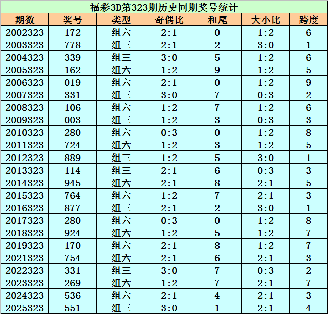福彩3D历年第323期同期奖号为:172 778 339 162 019 331 106 003 280 724 889 114 945 764 877 280 924 170 754 331 269 536 551。