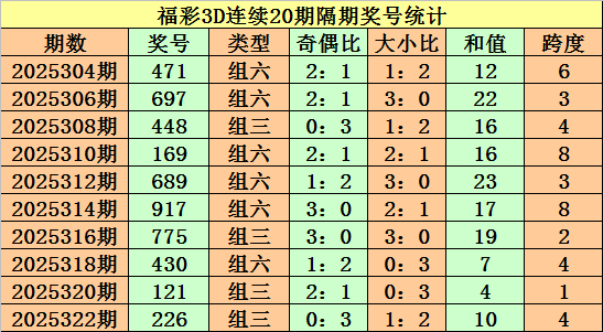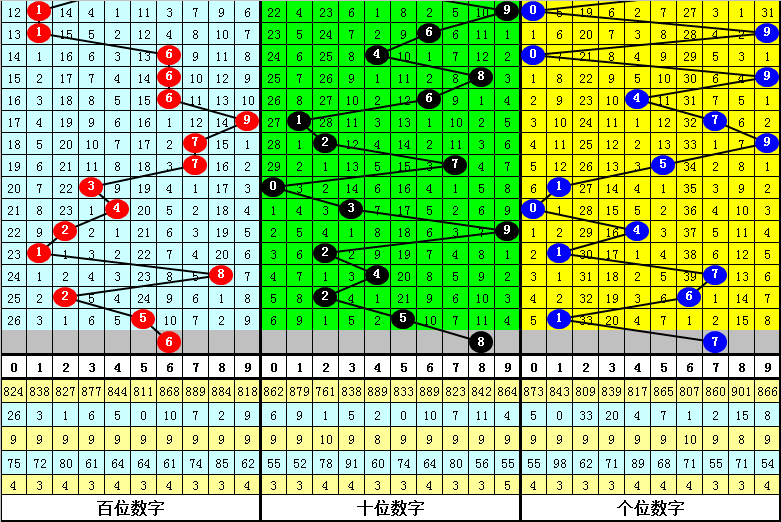 百位:2025319期-2025323期出号:21825,振幅为7点,分布比较分散,本期预计百位走大,参考6。