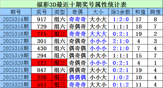 除3余数:上期除3余数比为0:1:2,上期余0号码轮空,本期防止余0号码继续走冷,余数比参考0:2:1。