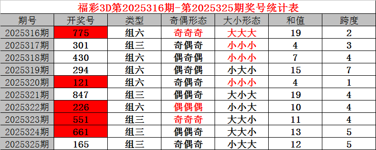 上期回顾:福利彩票3D第2025325期开奖结果165。奖号:奇偶奇、小大大,和值12,跨度5。
