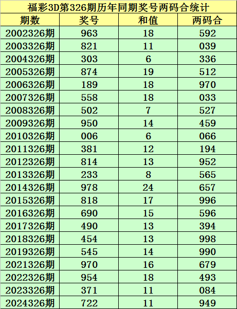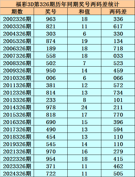 福彩3D第326期,历史上期开出22次奖号,其奖号分别为:963、821、303、874、189、558、502、950、006、381、814、233、978、818、690、490、454、545、970、954、371、722,奖号两码合差分别开出: