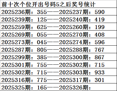 一、上期开奖:福利彩票3D第2025325期奖号为165。奇偶比为2:1,大小比为:2:1,奖号和值为12,奖号跨度为5。