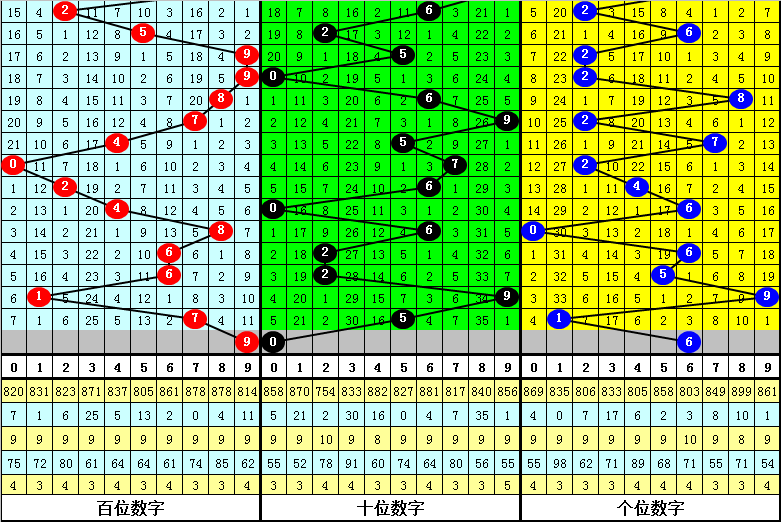 一、在下期开奖中,百位号码012路比为2:3:2,奇偶比为3:4,大小比为3:4,本期百位注意号码:0、4、9,胆码注意0路号码:9。
