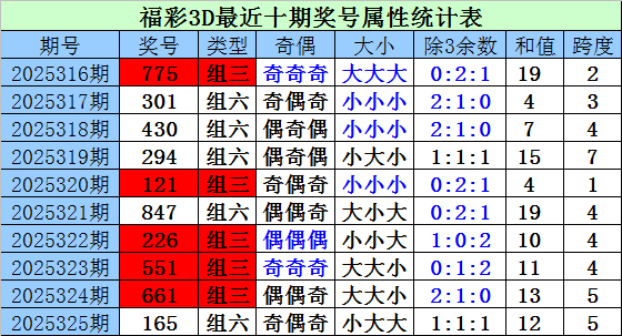 上期回顾:上期开奖奖号为165,类型:组六,奇偶奇,小大大,1:1:1,和值12,跨度5。