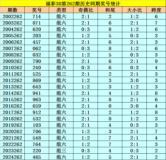 福彩3D历年第262期同期奖号为:714 871 620 203 457 062 032 790 240 525 869 643 941 963 659 912 532 103 706 548 764 220 465。