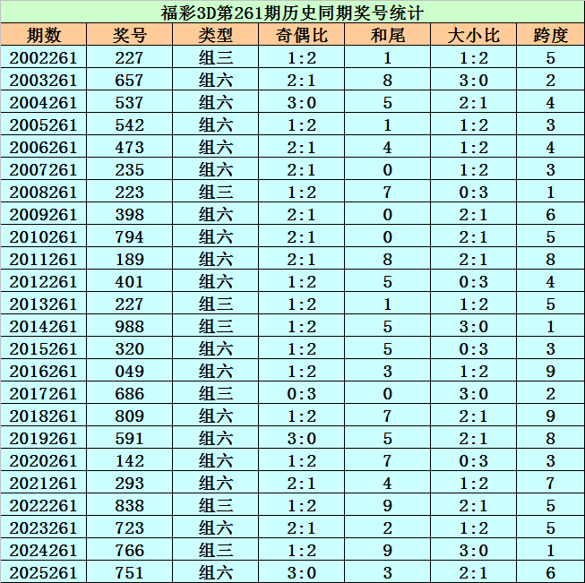 福彩3D历年第261期同期奖号为:227 657 537 542 473 235 223 398 794 189 401 227 988 320 049 686 809 591 142 293 838 723 766 751。