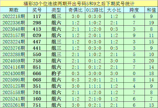 个位号码:最近两期个位开出号码为5-9,在福彩3D历史开奖中,前后两期个位分别开出号码5-9的奖号出现了97次。最近15期个位5-9组合出现之后,其下期奖号分别为:117-298-413-029-447-441-550-758-851-666-068-351-701-160-751;