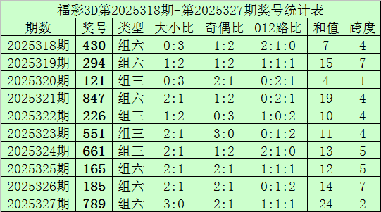 开奖回顾:福彩3D第2025327期奖号为789,其中奖号大小比为3:0,奇偶比为2:1,012路比为1:1:1,和值为24,跨度为2。