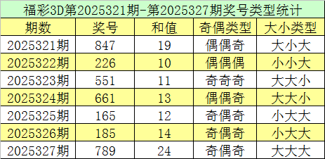 福彩3D第2025327期回顾:奖号为789,奖号奇偶比为2:1,大小比为3:0,和值为24,类型为组六。