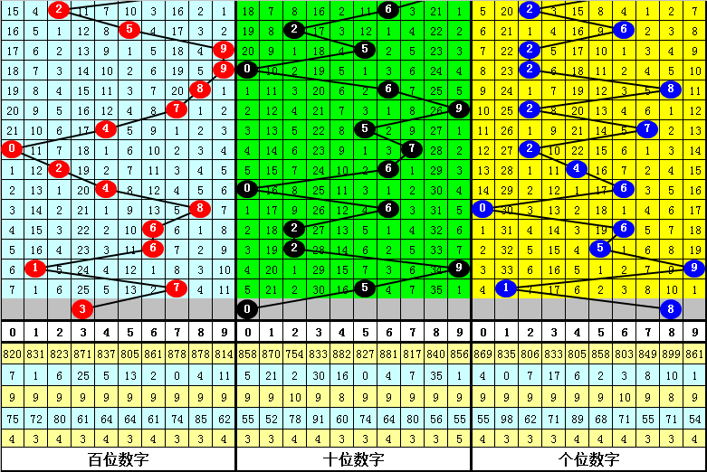 跨度分析:3D上期跨度为6,跨度近期波动较小,一般出现在4-8之间,本期看好跨度出现在5-9之间,最大跨度参考6789,参考跨度8。