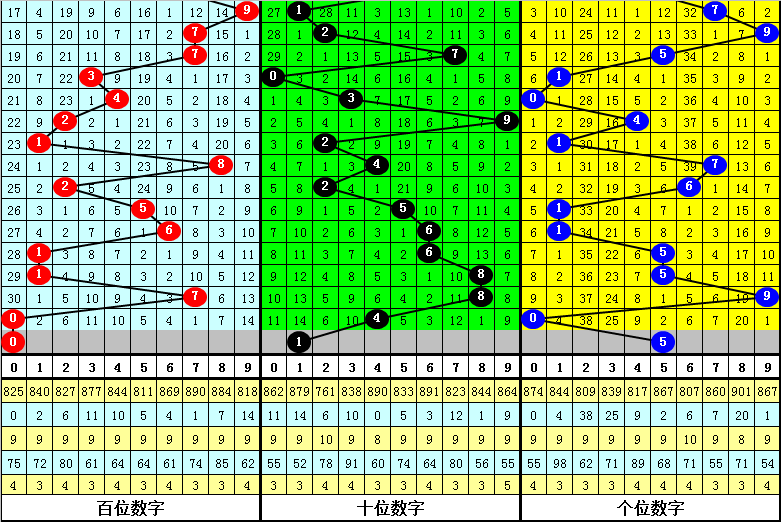 百位分析:百位上期开出号码0,历史上该位号码0出现了825次,最近100期号码0出现次,上期间隔30期再次出现。