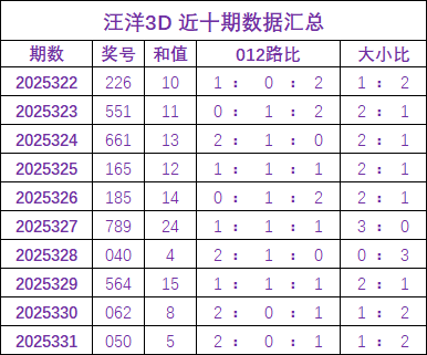 汪洋福彩3D第2025332期推荐: