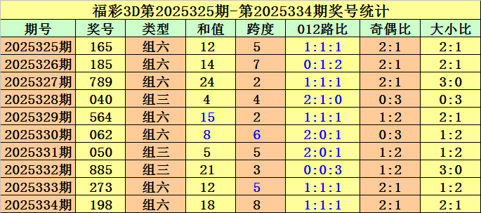 012路分析:上期012路比1:1:1,相等,本期关注2路号码走冷,012比参考1:2:0。