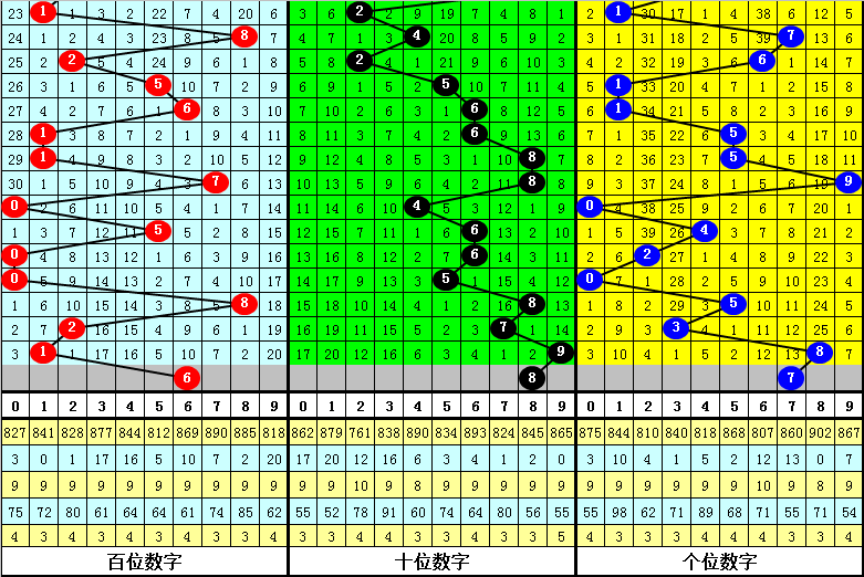 在历史同期号码中,组选0-9号码出现次数为:2、3出现4次,号码5、8出现5次,号码1出现6次,号码0、4、6出现7次,号码9出现8次,号码7出现13次,本期看好两码6、8出现。