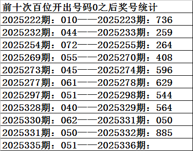 二、百位分析:上期开出号码0,前10次号码0出现之后下期分别开出号码:7224565508,其中号码大小比为6:4,基本相当;奇偶比为4:6,基本持平;012路比为2:2:6,0路号码表现较冷。本期参考号码:0。