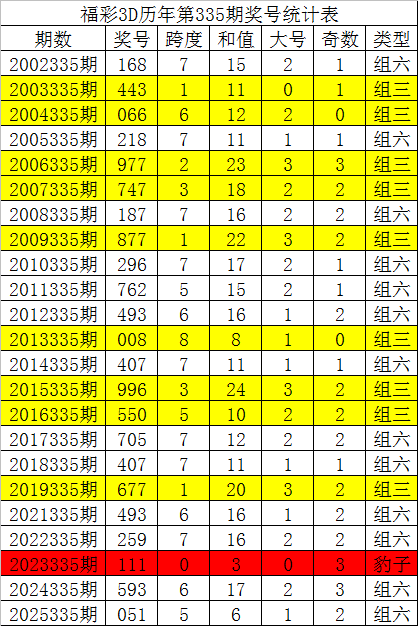 从以上统计可以看出,历年3D第336期开出了5次组三号码,开出了17次组六号码。组六号码出现概率大,本期预计开出组六号码。