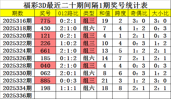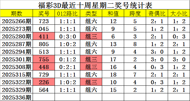 奖号类型分析:从近期周二开奖数据分析,组六号码最近十周出现6次,表现较冷,上周二开出组六,组三开出4次,表现相对较热,本周二预计组六号码回补。