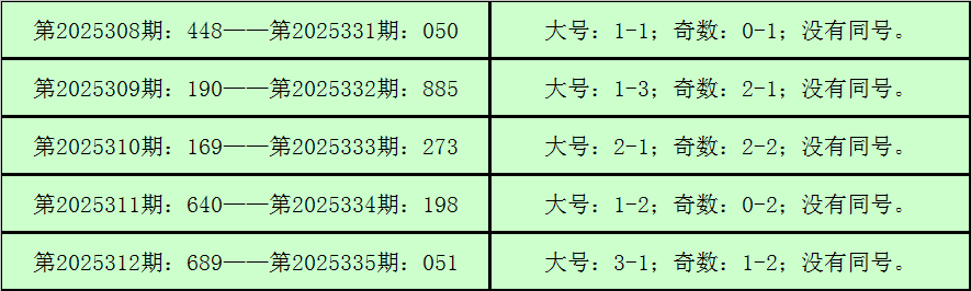 所以,3D第2025306期开出奖号:697,其大小比为3:0,奇偶比为2:1,012路比为2:1:0,与3D第2025336期奖号可能有同号。