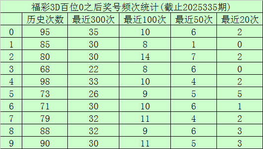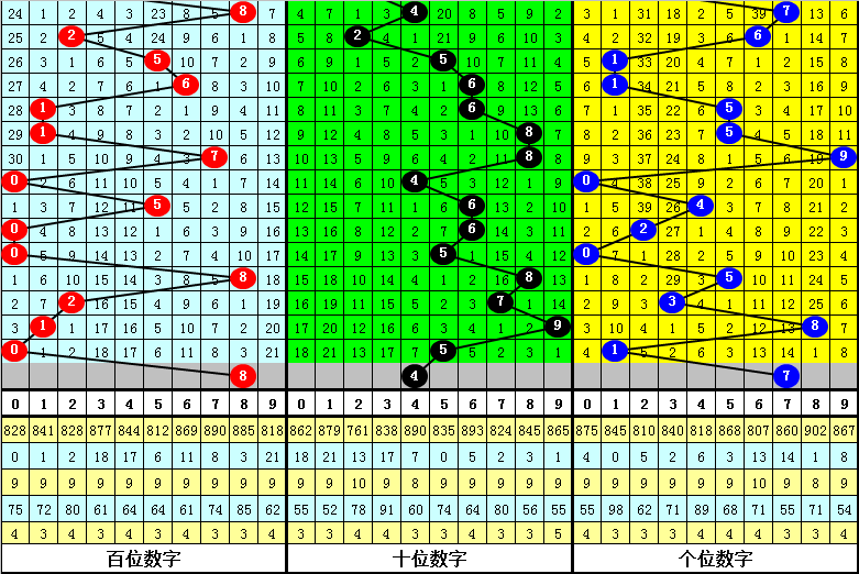 百位杀号:上期百位开出号码0,历史上百位号码0已开出828次了,最近100次百位号码0出现之后,其下期各号码频次分别为:号码2出现14次,7、9出现11次,0、4、6出现10次,5、8出现9次,1、3出现8次。