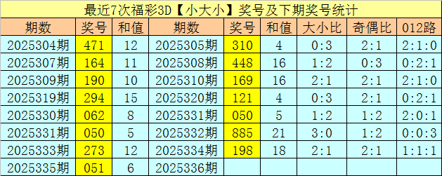 一、福彩3D上期奖号为051,大小类型开出:小大小,历史上该大小类型奖号共出现1033次,最近7次【小大小】奖号分别开出:471、164、190、294、062、050、273,其中组三号码出现1次,组六号码出现6次。