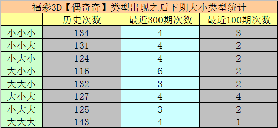 二、最近7次【小大小】奖号之后,其下期分别开出号码:310、448、169、121、050、885、198,其中组三号码出现4次,组六号码出现3次。本期预计开出组六号码。