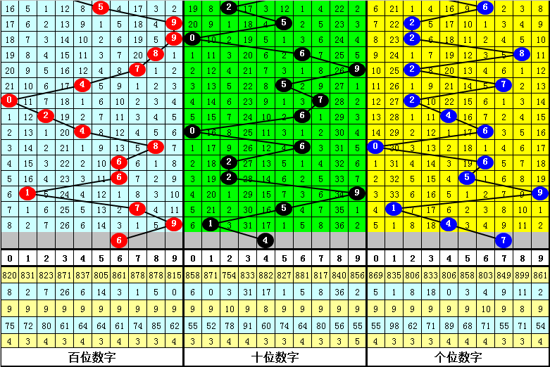 (2)在号码频次方面,开出个数最少的三个号码为:3、0、1,一般来说这三个号码不会同时出现;开出个数最多的四个号码分别为:6、2、9、7,本期看好这四个号码中包含1-2个开奖号码,胆码参考7。6。