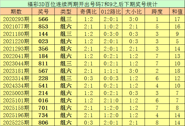 百位号码:连续两期百位出号分别为:7-9,历史上福彩3D连续两期前后分别出号7-9的奖号共出现80次。在百位7-9的奖号现象出现时,近15期下期分别出号:566-853-144-023-356-184-811-567-228-541-214-016-701-734-806;