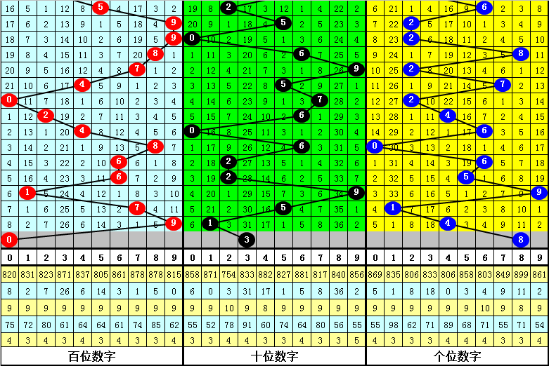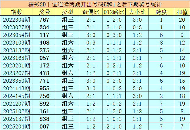 十位号码:前两期十位分别出现奖号5-1,历史上福彩3D连续前后分别开出号码5-1的现象共开出92次。在十位5-1的现象出现时,最近15期其下期分别开出号码:767-334-117-408-275-057-172-478-771-955-756-892-161-838-007;