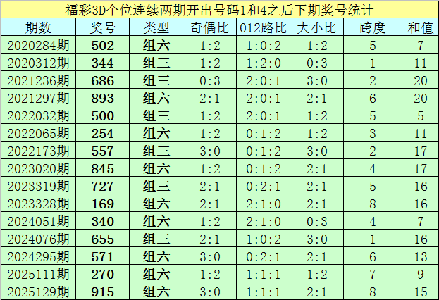 个位号码:最近两期个位开出号码为1-4,在福彩3D历史开奖中,前后两期个位分别开出号码1-4的奖号出现了75次。最近15期个位1-4组合出现之后,其下期奖号分别为:502-344-686-893-500-254-557-845-727-169-340-655-571-270-915;