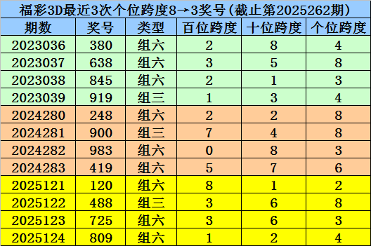 第2025121-第2025123期奖号:120、488、725,其下期奖号为:809,末位号码跨度为1;
