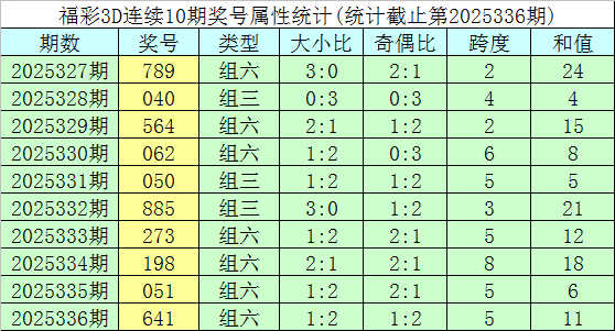开奖回顾:福彩3D第2025336期奖号为641。奖号形态为组六,大小形态为大小小,奇偶形态为偶偶奇,和值为11,跨度为5。