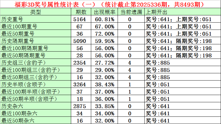 福彩3D第2025334期奖号为198,第2025336期奖号为641,隔期奖号出号1。从统计表中分析,最近100期隔期奖号出现56期,出现比例为56%,最近50期隔期奖号出现28期,出现比例为56%,最近10期隔期奖号出现 4期,出现比例为40%,本期预计隔期号继续出号。